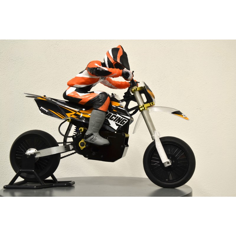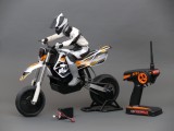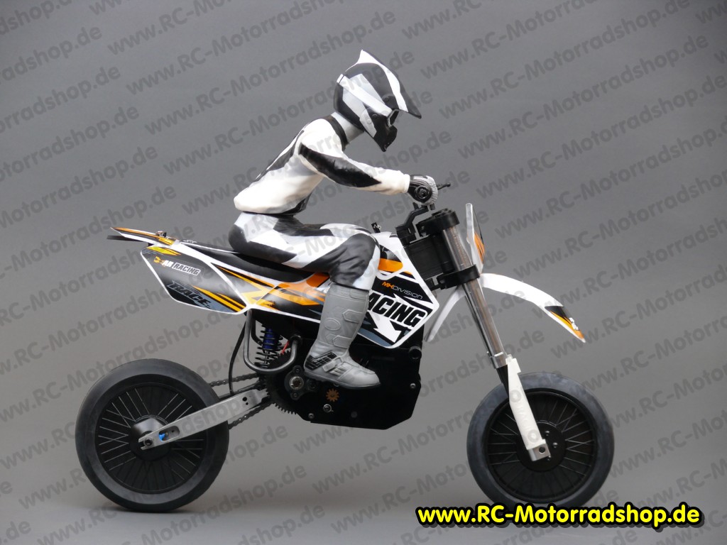 Supermoto-Motorrad im Maßstab 1:4 (BASE-Kit – vormontiert) mit elektrisch angetriebenem Gyro-Kreiselsystem im Hinterrad. Der Bausatz ist bis auf die Elektronik komplett vormontiert, inkl. E-Gyro. Zum Betrieb wird eine 2-Kanal Fernsteuerung mit einem Servo, ein Fahrtregler mit Motor (540er Größe, idealerweise Brushless), sowie ein Fahrakku (LiPo 7,4V oder NiMH 7,2V, jeweils in Block- oder Stick-Form) benötigt. Weitere Infos zu diesem Modell finden Sie unter AR Racing ARX-540 & ARM-540.