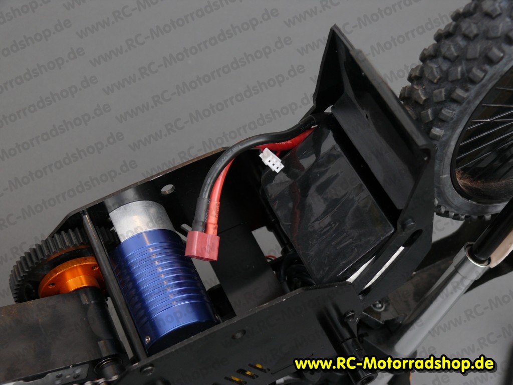 Cross-Motorrad im Maßstab 1:4 (BASE-Kit) mit elektrisch angetriebenem Gyro-Kreiselsystem im Hinterrad. Geeignet für den Einsatz im Gelände. Das Modell ist fahrbereit aufgebaut mit 3300kV Brushless-Set, 2.4GHz Fernsteuerung und 7,4V – 3200 mAh LiPo-Akku (Block-Type). Zum Laden des Akkus wird noch ein Ladegerät benötigt (siehe Zubehör). Weitere Infos zu diesem Modell finden Sie unter AR Racing ARX-540 & ARM-540.