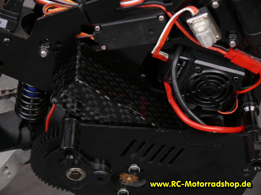 Soll das Modell bereits vormontiert (ARR = almost ready to run) oder gar fahrfertig aufgebaut sein (RTR = ready to run), dann kommt ohnehin nur das BASE-Kit in Frage, denn nur dieses ist wahlweise auch vormontiert oder sogar schon fahrbereit aufgebaut lieferbar. Das ARR Bike ist wie der Baukasten ausgestattet, allerdings bereits vormontiert. Im RTR-Kit enthalten ist das fahrfertig aufgebaute Modell inkl. vorbereiteter Verkleidung (unlackiert, aber mit Dekorsatz beklebt) + Fahrerpuppe inkl. eingebauter Fernsteuerung (2.4GHz), Lenkservo, Brushless-Antriebsset mit 3300kV Motor und Fahrakku (LiPo 7,4V - 3200 mAh). Der Akku ist in Würfelform, kann somit tief unten im Akkuschacht verbaut werden (tiefer Schwerpunkt), es lassen sich aber auch alle normalen 7,4V Stick-Akkus (145mm lang, mit Ultra-Deans Stecker) im Akkufach unterbringen. Wer den Bausatz in Einzelteilen bevorzugt, kann sich zwischen BASE-Kit und PRO-Kit wählen. Der Bausatz enthält alle Teile zum Aufbau des Chassis (inkl. E-Gyro), es wird jedoch ebenso wie beim vormontierten ARR-Modell noch eine Fernsteuerung, Lenkservo, Antriebsmotor (540er Größe) + Regler sowie ein Akku benötigt.