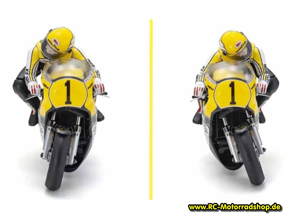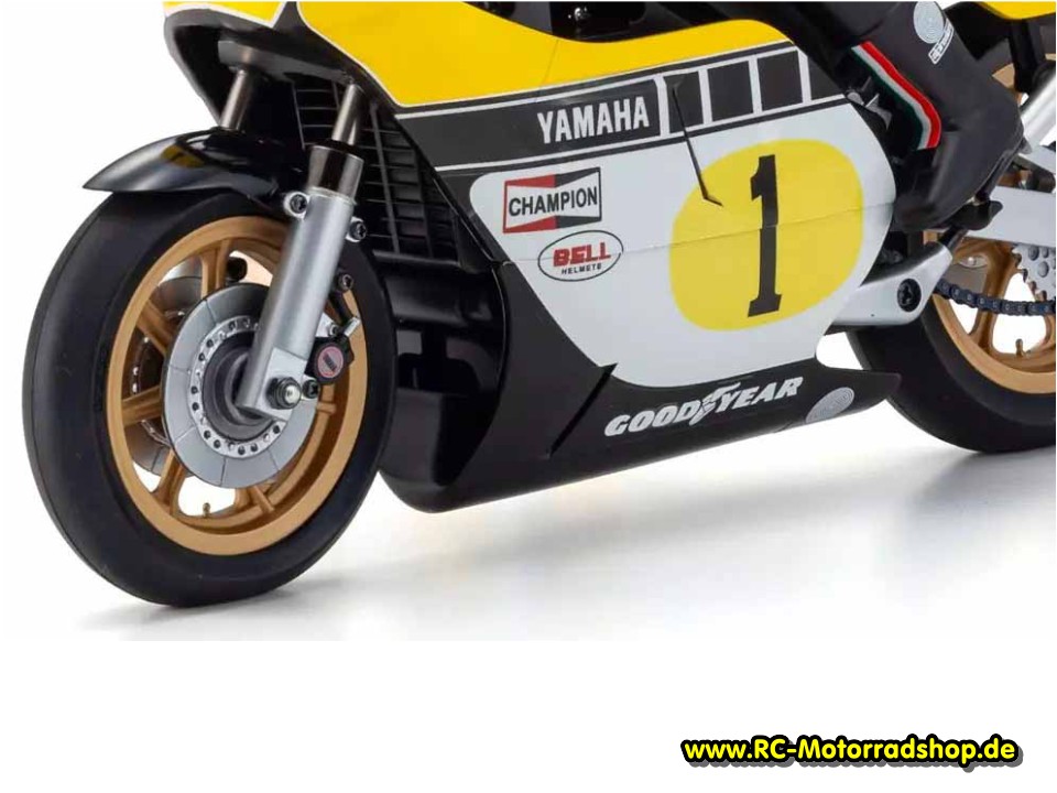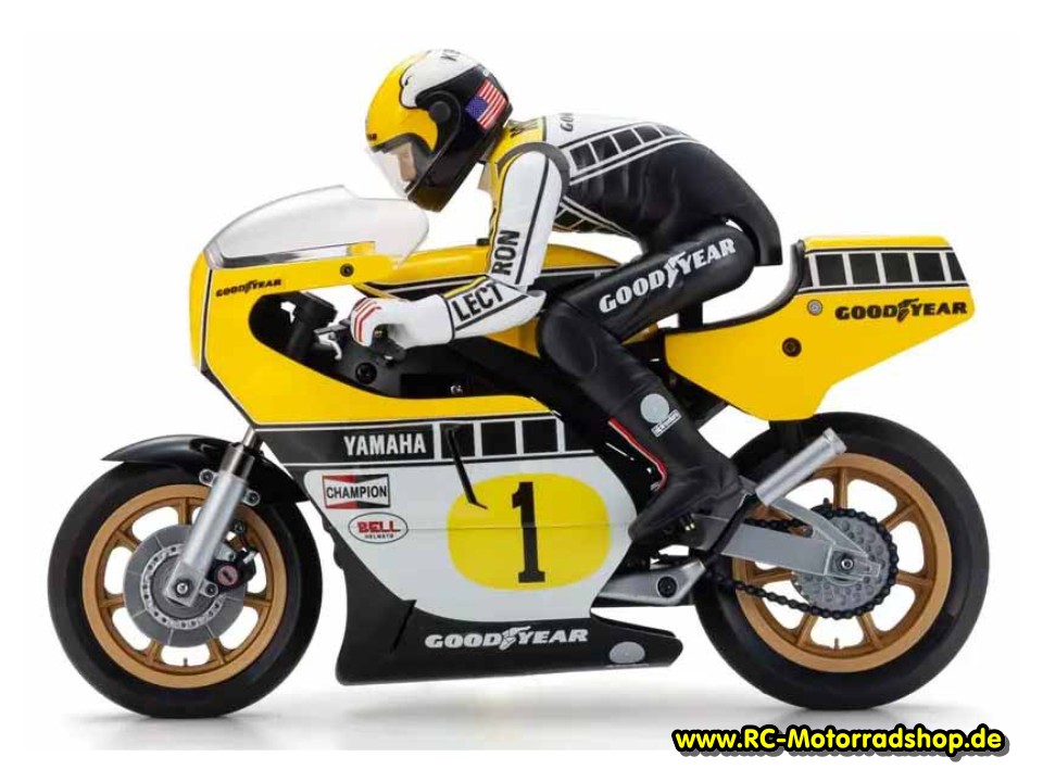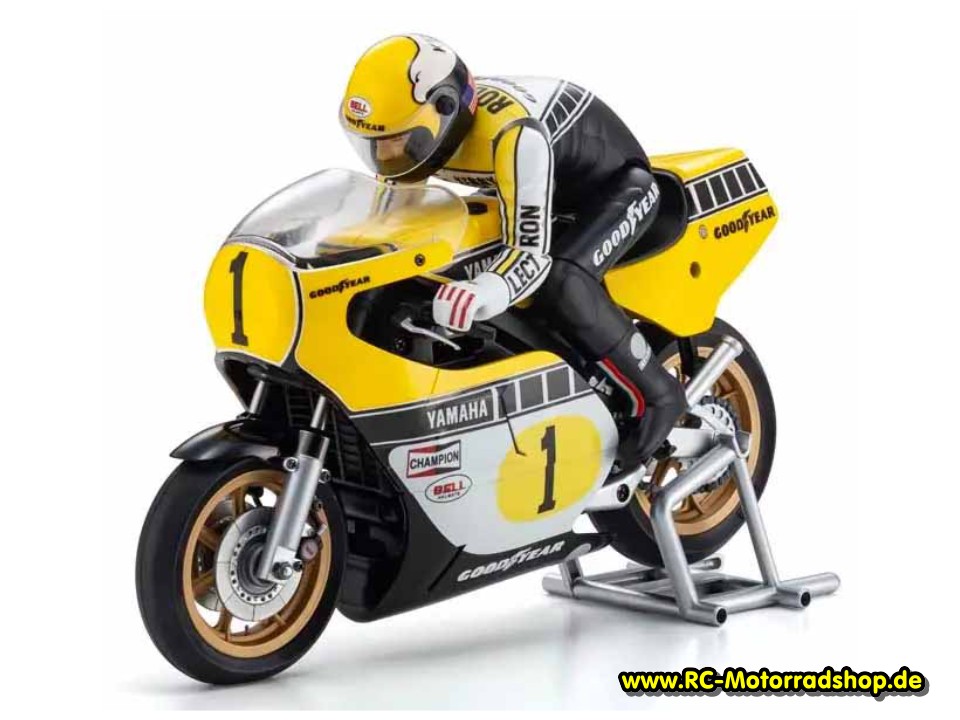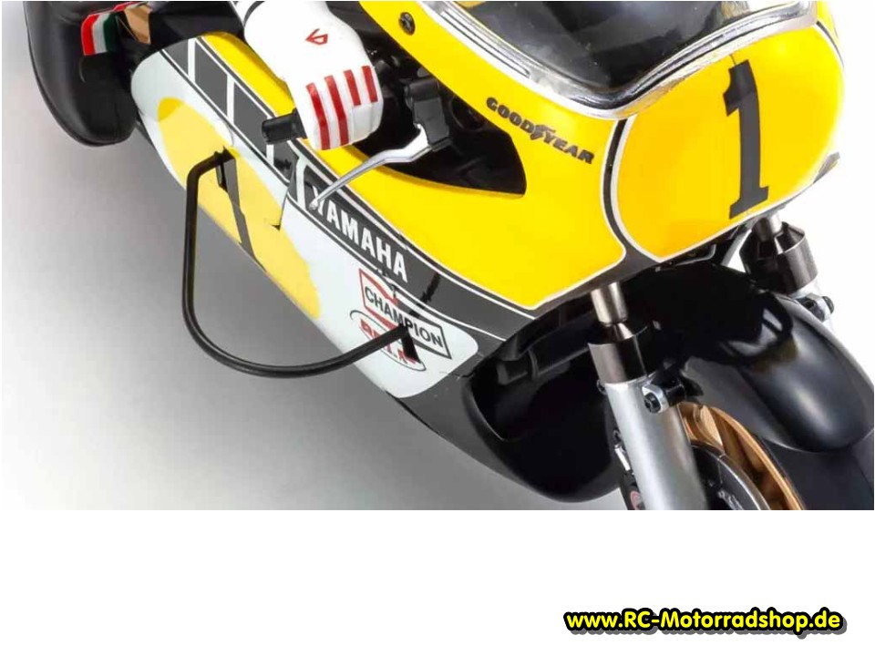 RC-Motorradmodell der Yamaha YZR500 (Yamaha GP-Motorrad der 70er Jahre) im Maßstab 1:8. Die bewegliche Fahrerpuppe lehnt sich bei Kurvenfahrt im "Hanging-off"-Stil vom Motorrad. Das Modell wird als Bausatz mit Motor geliefert. Zum Betrieb wird eine 2-Kanal Fernsteuerung mit kleinem elektronischen Fahrtregler und Mini-Servo benötigt. Alle weiteren Infos zu diesem Modell finden Sie unter Kyosho Motorräder Hang' on 1:8.