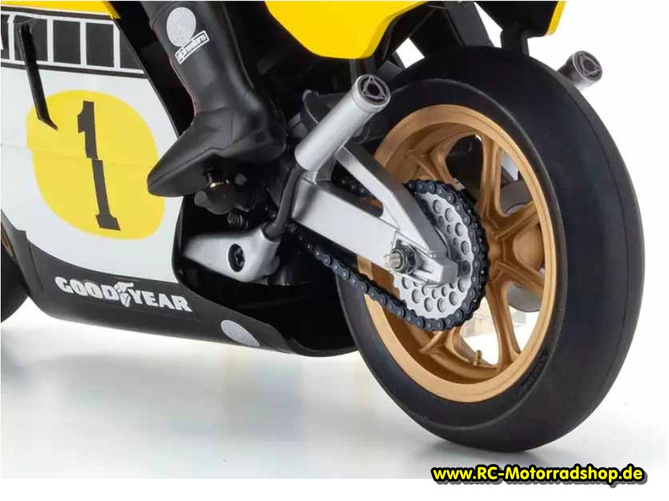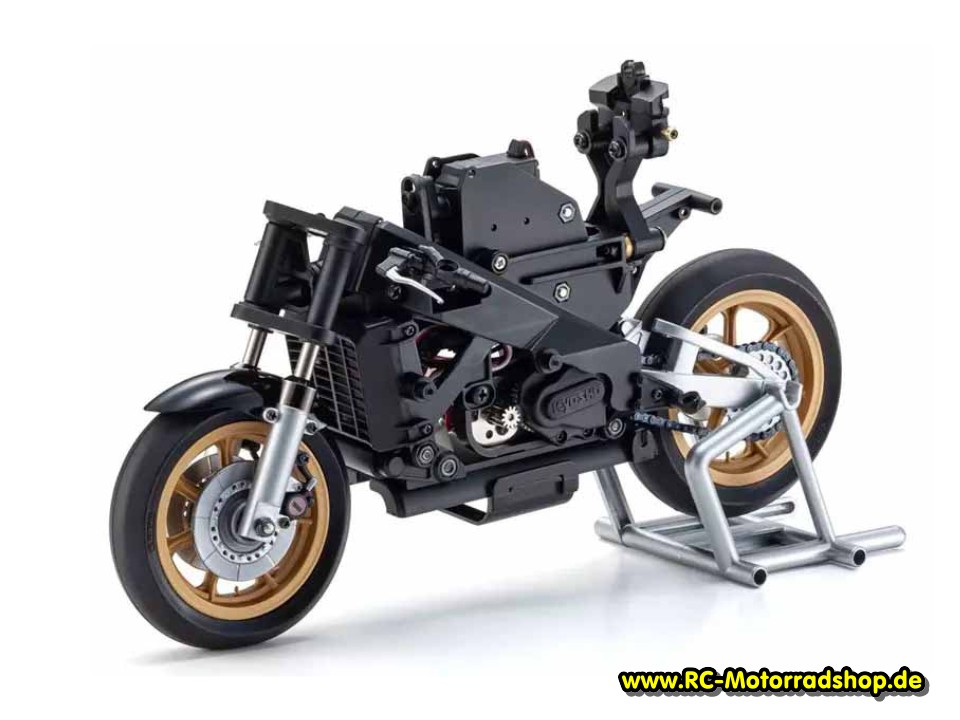 Die Kyosho-Modelle besitzen einen vorbildgetreuen Rahmen im Delta-Box-Design. Die gelenkte Federgabel und die sich bewegende Fahrerpuppe sorgen für einen einfache Steuerung des Bikes und perfekte Optik. Die Stabilisierung des Motorrads erfolgt einzig durch den Kreiseleffekt des mit einem zusätzlichen Gewicht ausgestatteten Vorderrads. Die Fahrerpuppe bewegt Arme, Kopf und Beine über eine ausgefeilte Mechanik synchron zu den Lenkbewegungen.