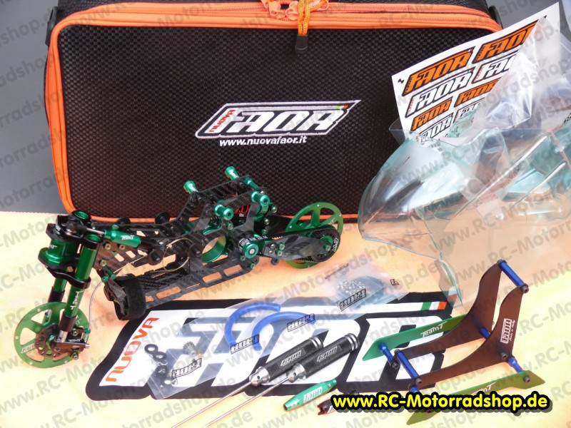 Die Nuova Faor T15 ist in zwei verschiedenen Versionen Lieferbar: Als Superbike mit Vorderradbremse und 32DP Hauptzahnrad und als Stockbike ohne Vorderradbremse und mit 48DP Hauptzahnrad. Natürlich ist auch die NF T15 voll kugelgelagert. Das Modell wird bereits vormontiert geliefert, nur die Verkleidung sowie der Fahrer sind aus klarem Lexan und können so individuell lackiert werden. Im Lieferumfang des Bikes enthalten sind außerdem ein Hinterradständer, etwas Werkzeug, ein NF Pit Towel und eine praktische Transporttasche für das Bike.