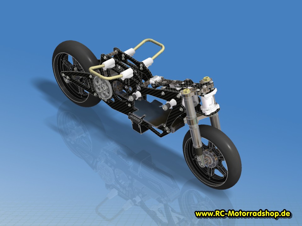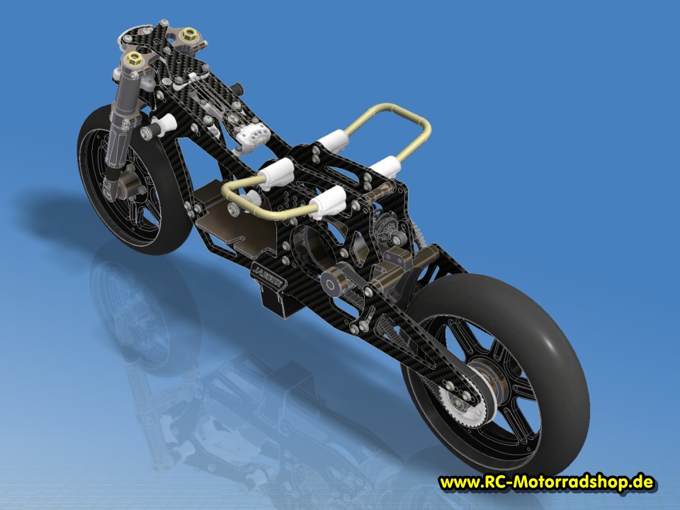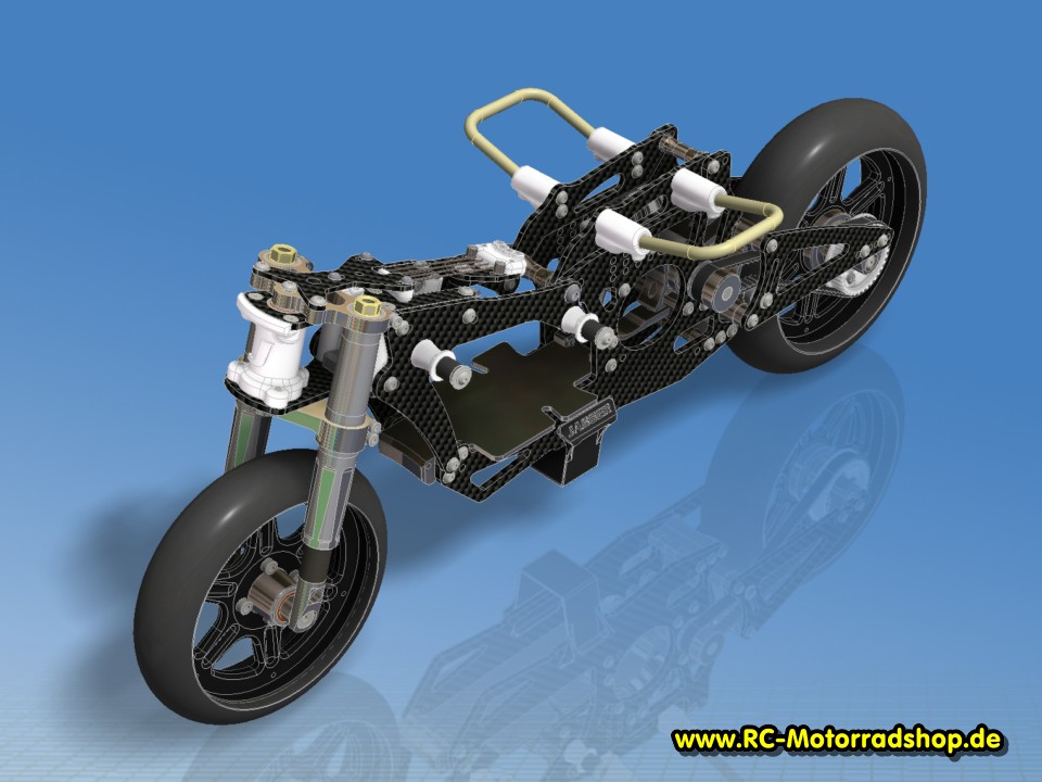 JABBER TWO – Wettbewerbs-Motorradmodell im Maßstab 1:5 – Stockbike ohne Bremse, mit Federstablenkung SDS2.0. Top-Features: Klassisches Schwingenkonzept mit Antriebsachse und Schwingendrehpunkt auf einer Linie; verbesserte Gabel mit von außen einstellbarer Vorspannung und Höhe + separate und damit austauschbare Dropouts aus Edelstahl; Schwinge mit Alu-Dropouts für die Achsaufnahme, damit 3 verschiedenen Radstände möglich; Fahrwerkshöhe hinten per Feingewindeschraube einstellbar; neuer Big-Bore Hinterraddämpfer; Riemenrad 36T; Front-Chassis in zwei Positionen fahrbar; Akkuhalterung. Bausatz enthält eine komplette, unlackierte Verkleidung und einen Satz GRP M3 Reifen auf Sternfelgen. Zum Betrieb des Modells werden noch folgende Teile benötigt: Eine 3-Kanal Fernsteueranlage, Lenkservo KST A15-1810 V8.0, ein Brushless-Set (Motorgröße 540), ein LiPo-Akku (2S Hardcase) sowie ein 32DP Ritzel und Silikonöl (Empfehlung Gabel 500 cst / Hinterraddämpfer 1000 cst).