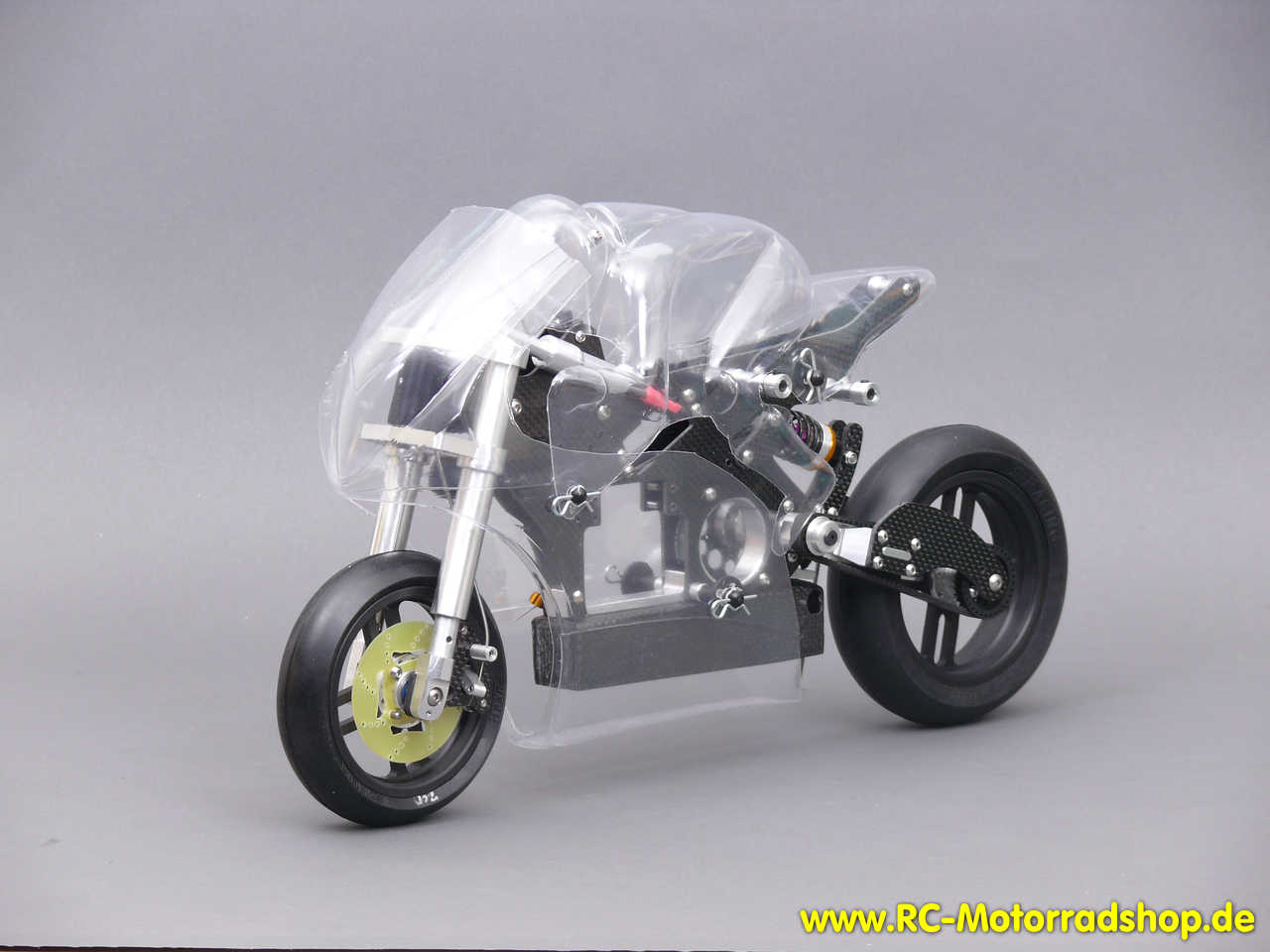 Das Bike wird bereits vormontiert geliefert. Im Kit ist eine zweiteilige unlackierte Verkleidung enthalten, deren Oberteil eine Fahrerpuppe mit einschließt, somit entfällt eine aufwendige Befestigung einer externen Fahrerpuppe. Ebenfalls enthalten ist ein dekorativer Ständer für das Bike.